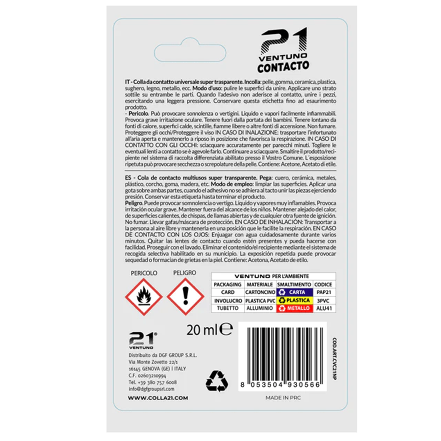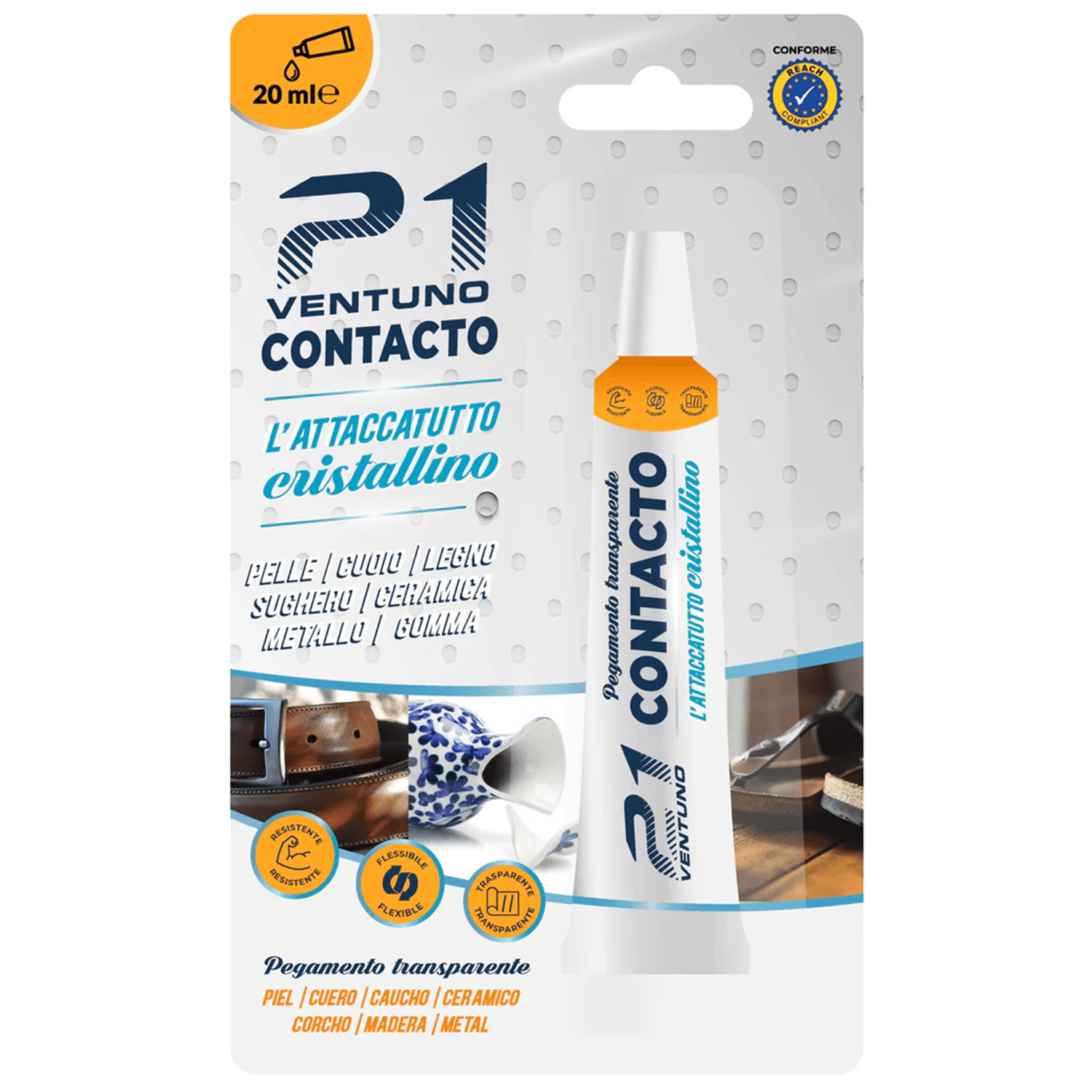 Colla 21 Contacto – Adesivo a Contatto Universale Policloroprenico Trasparente – Gomma Cuoio Legno Ceramica Pelle – Tubetto 20 ml