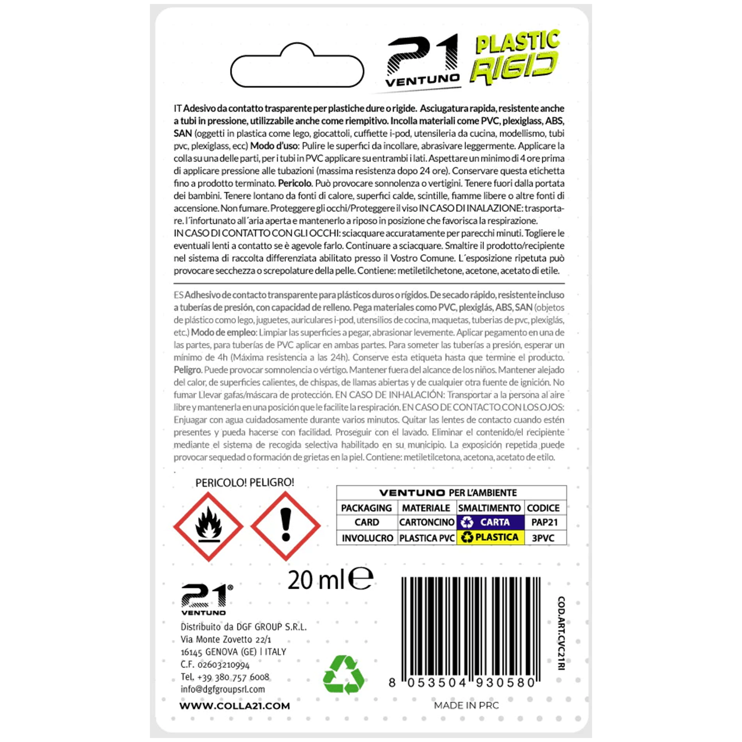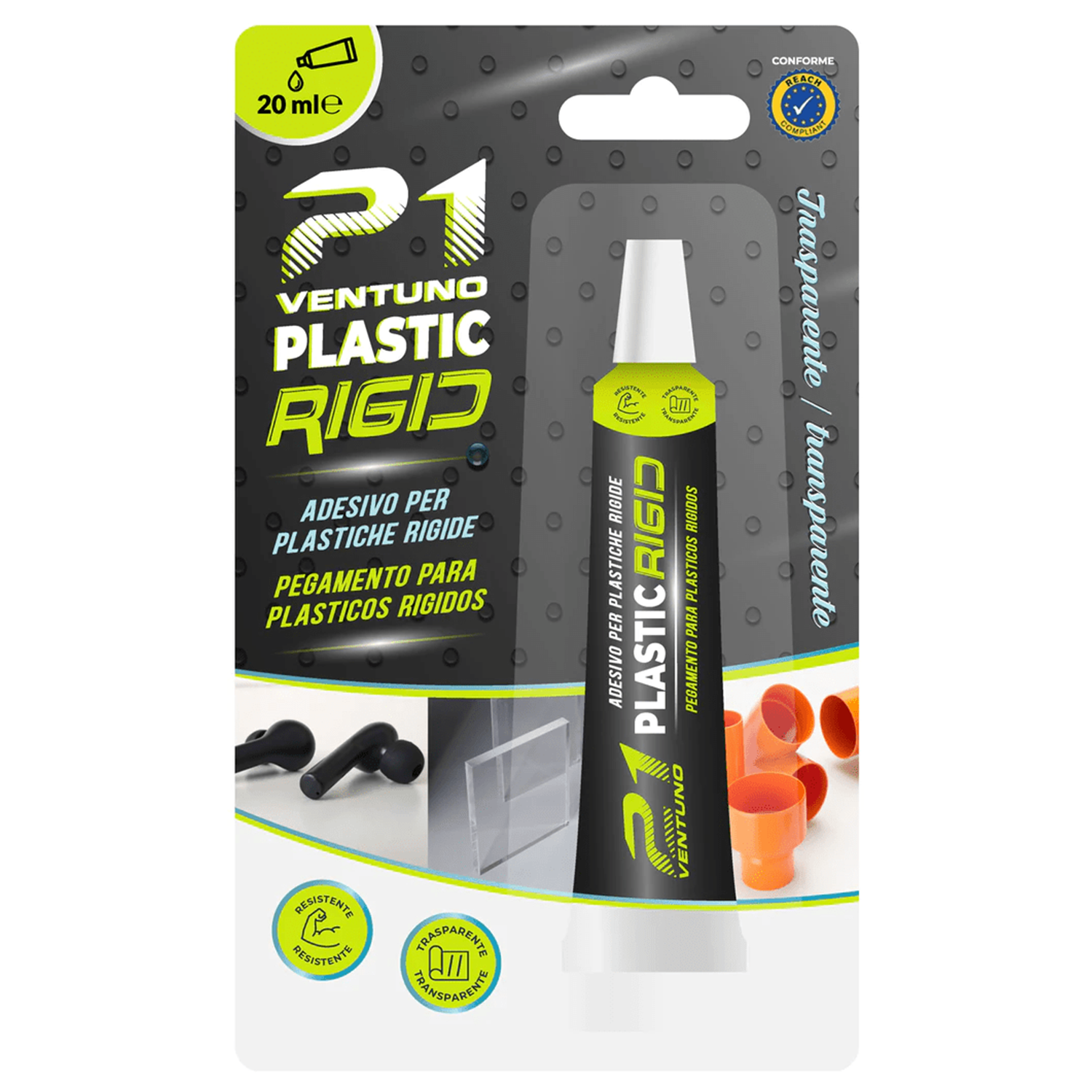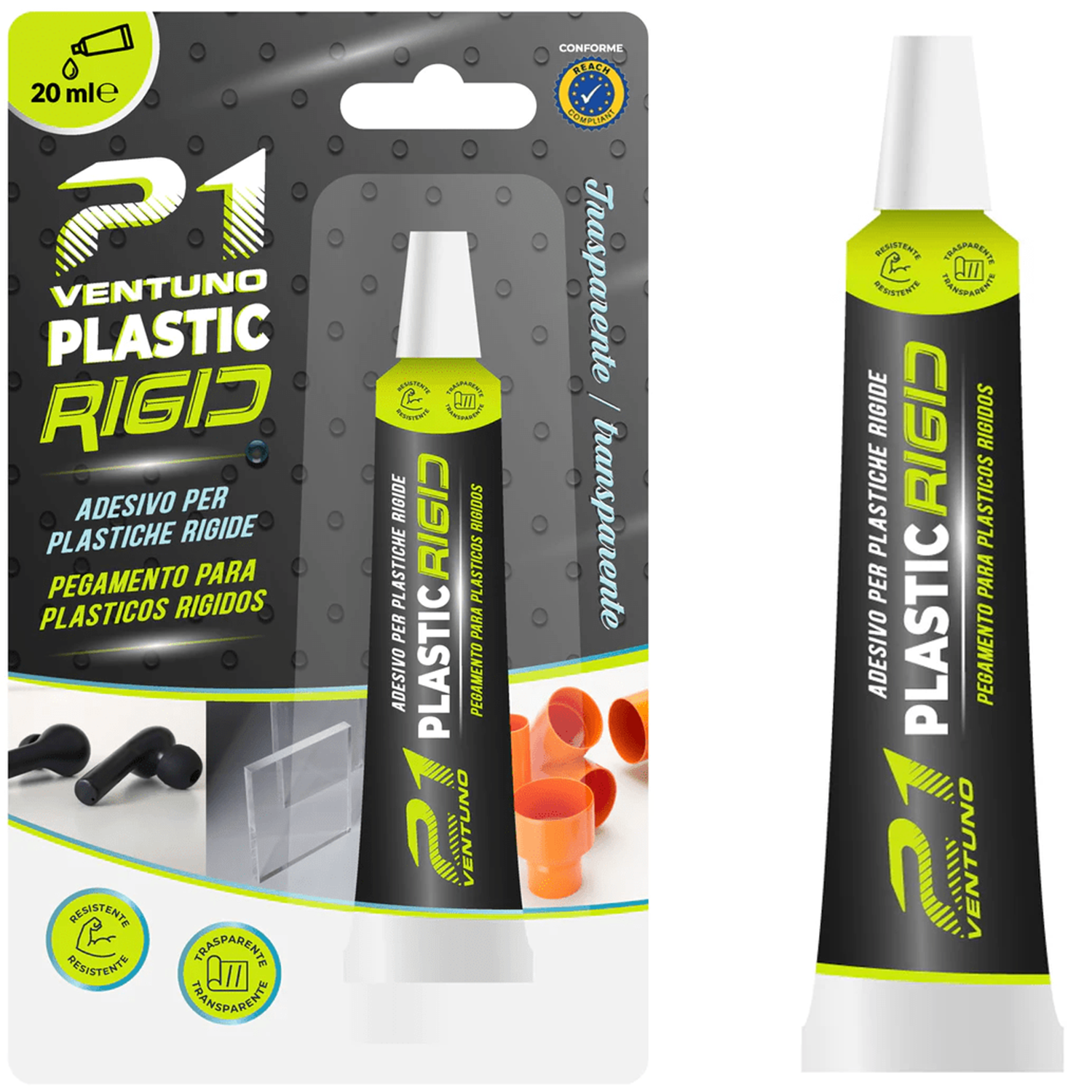 Colla 21 Plastic Rigid – Adesivo Trasparente per Plastiche Rigide PVC Plexiglass ABS – Saldante Chimico – Tubetto 20 ml