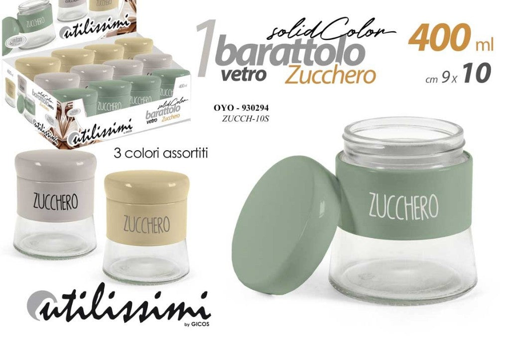 BARATTOLO VETRO ML.400 CM.9X10h ZUCCHERO OYO COL. ASS.