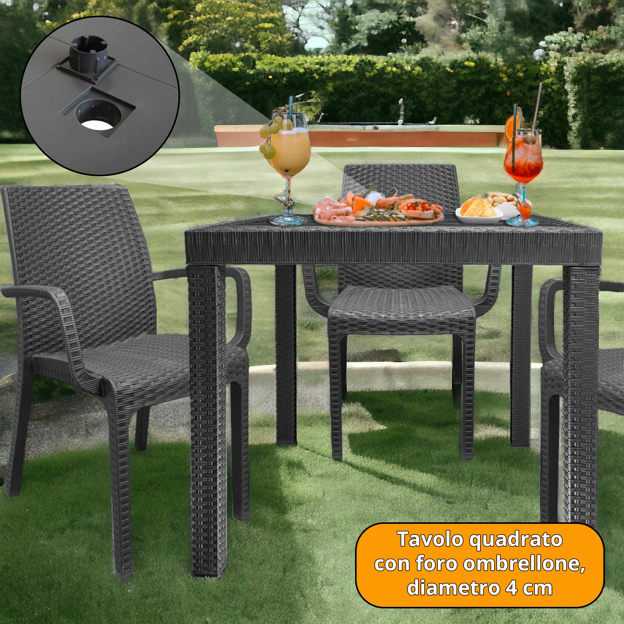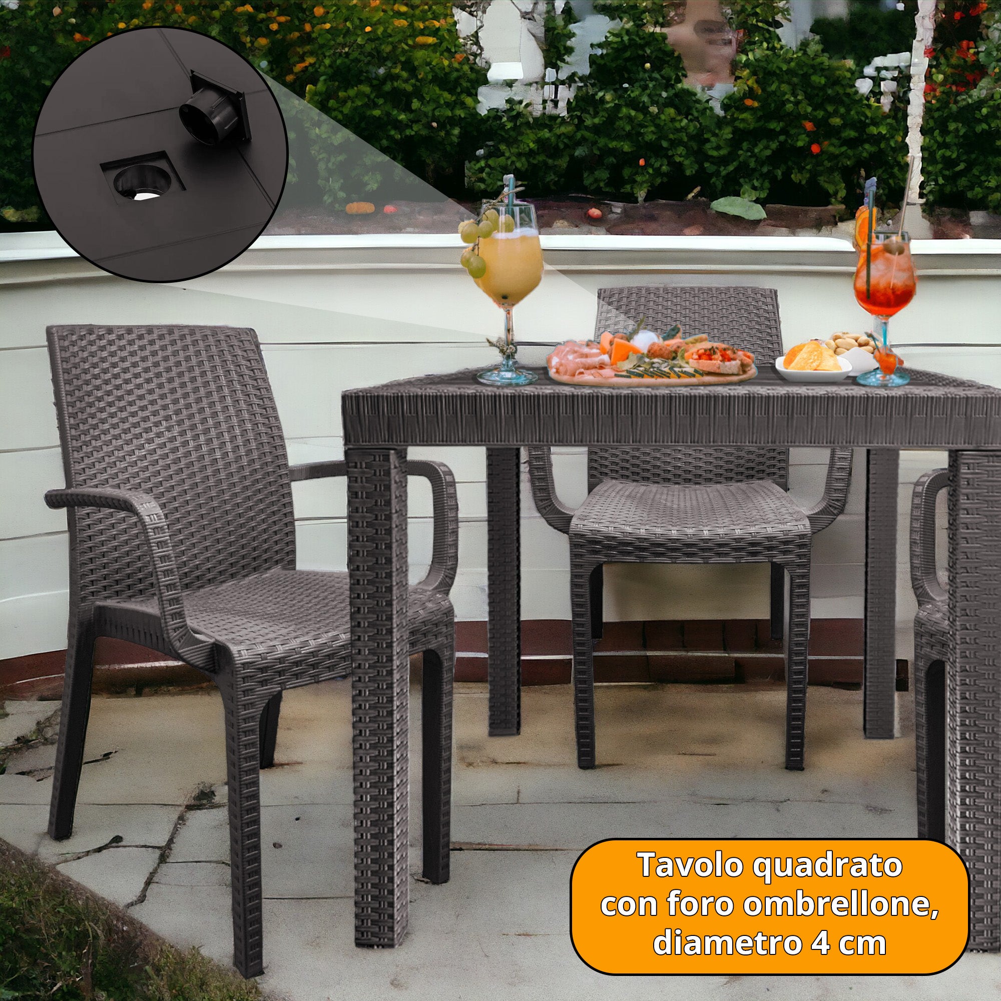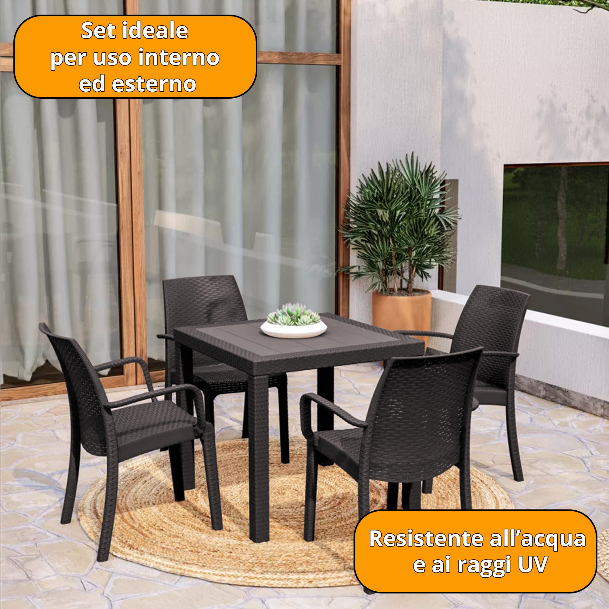 Bica Set Completo Tavolo Dallas 80×80 cm + 4 Poltrone Indiana Polipropilene Rattan per Interni Esterni Antracite/Bianco/Marrone