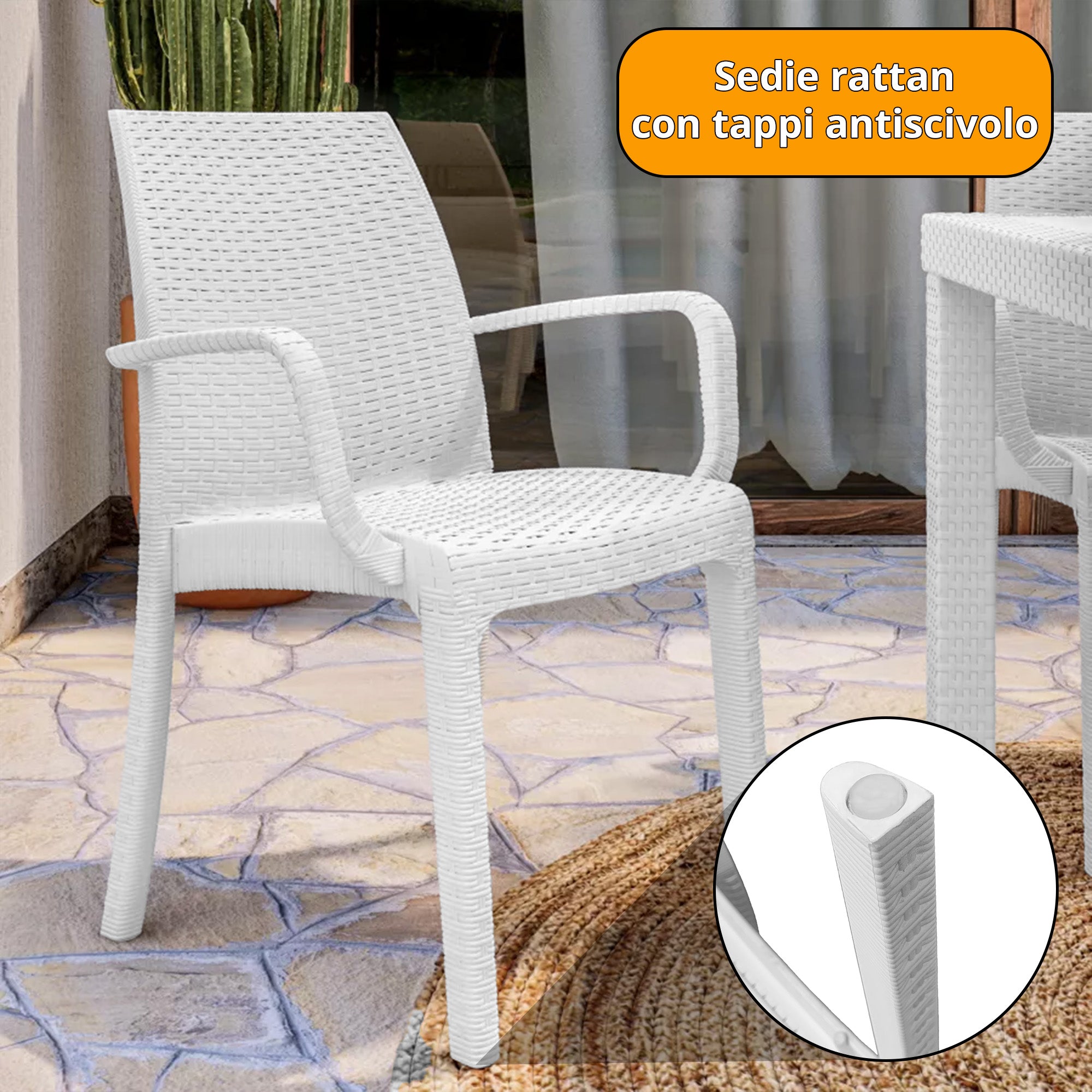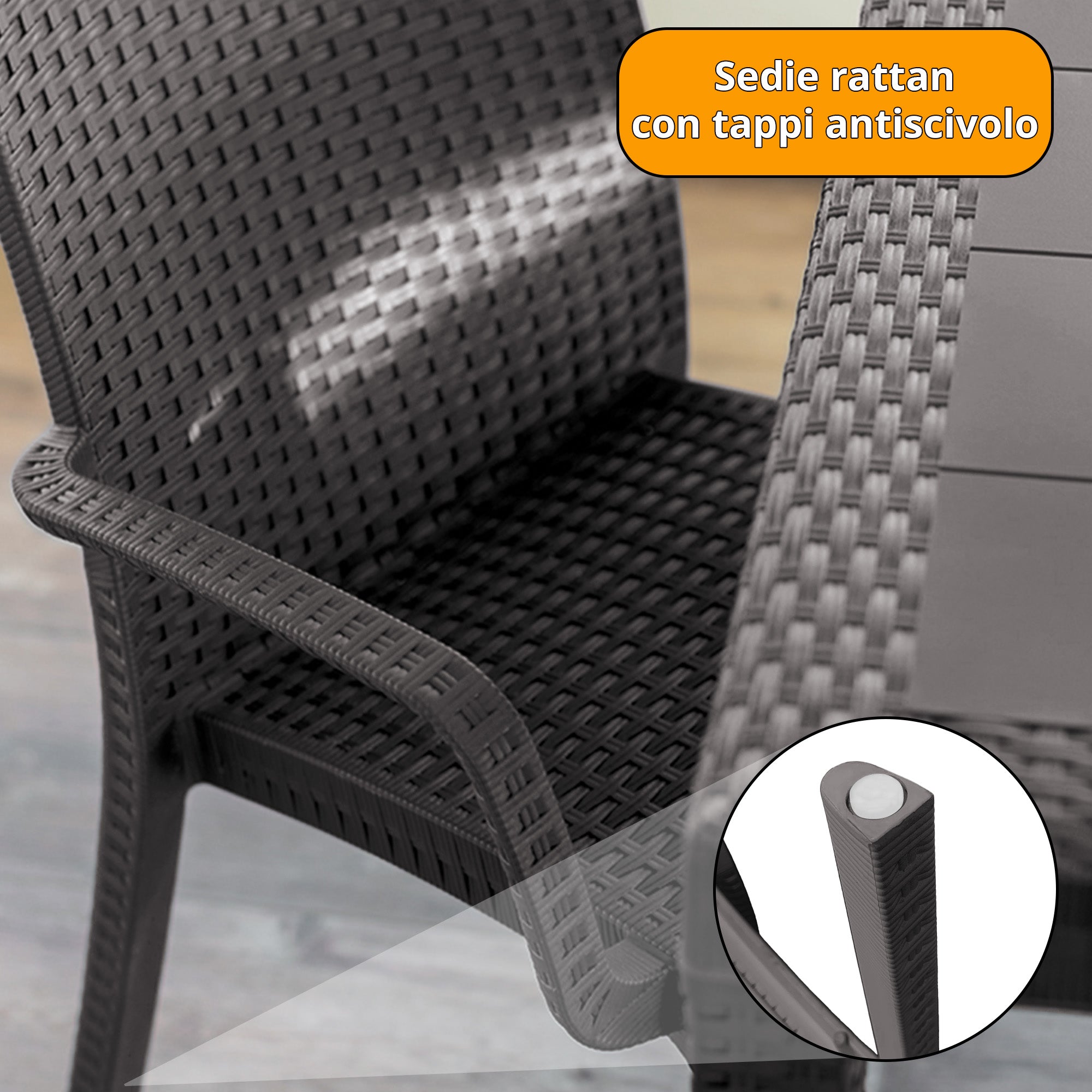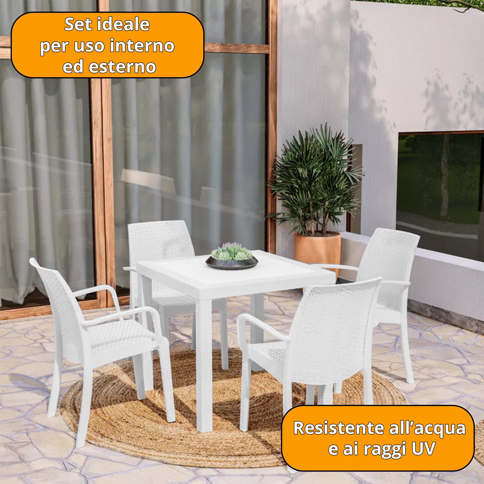 Bica Set Completo Tavolo Dallas 80×80 cm + 4 Poltrone Indiana Polipropilene Rattan per Interni Esterni Antracite/Bianco/Marrone