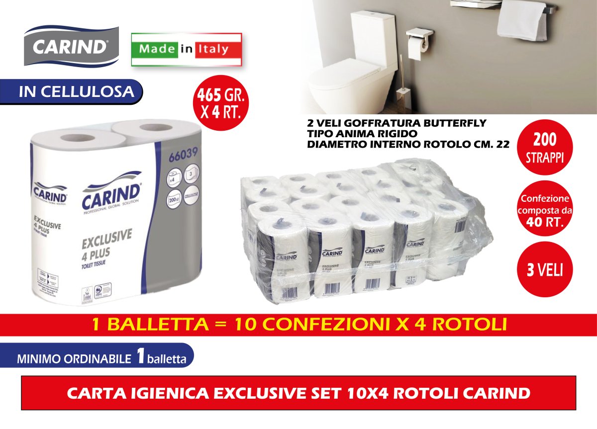 Carind Carta Igienica Exclusive Confezione 10x4 Rotoli, 3 Veli In Cellulosa, 200 Strappi, Lunghezza Fino A 22 Metri, Uso Casalingo Hotel Formato Famiglia Pacco