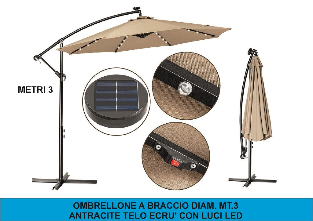 OMBRELLONE A BRACCIO DIAM. MT.3 ANTRACITE TELO ECRU' CON LUCI LED