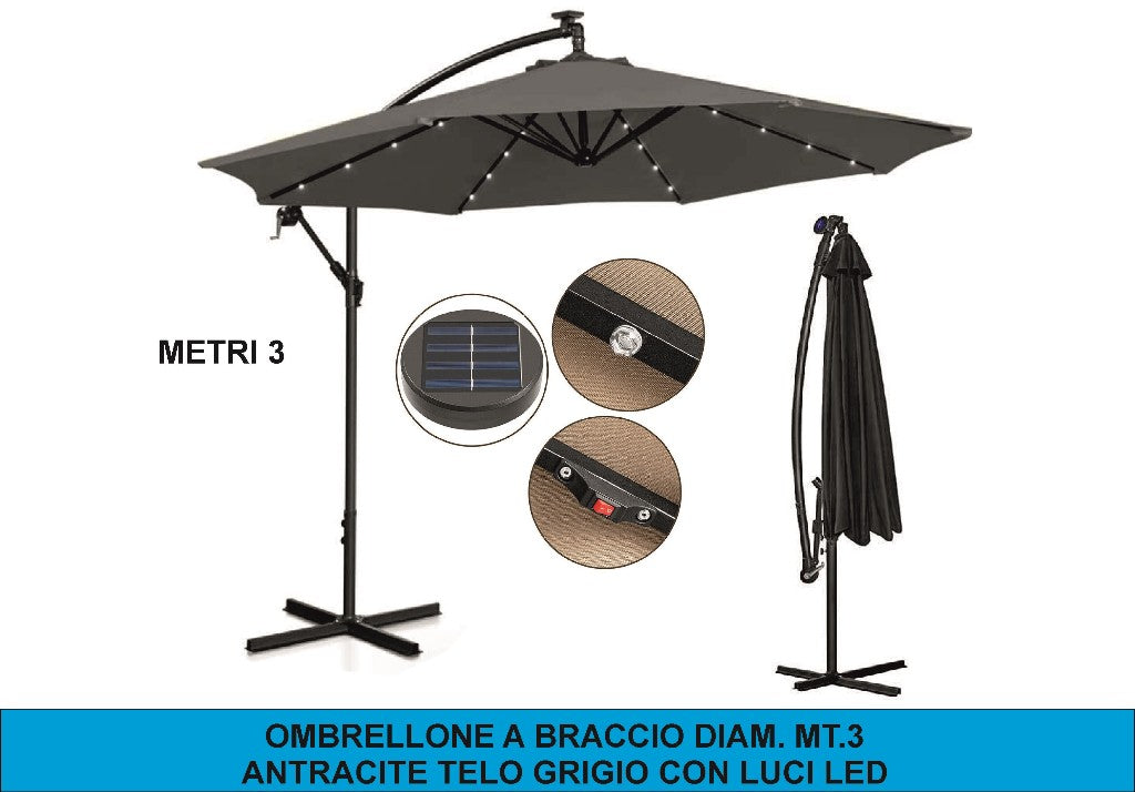 OMBRELLONE A BRACCIO DIAM. MT.3 ANTRACITE TELO GRIGIO CON LUCI LED