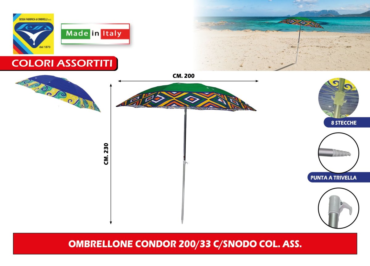 Prodotto dalla storica Fabbrica Sessa (attiva dal 1873), l'ombrellone Condor non è il solito articolo da supermercato. È realizzato con una solida struttura a 8 stecche in acciaio verniciato (filo 4,20 mm) e un palo in vero alluminio satinato. Questo significa resistenza eccezionale al vento, niente ruggine e una durata che copre intere estati, non solo un paio di weekend.