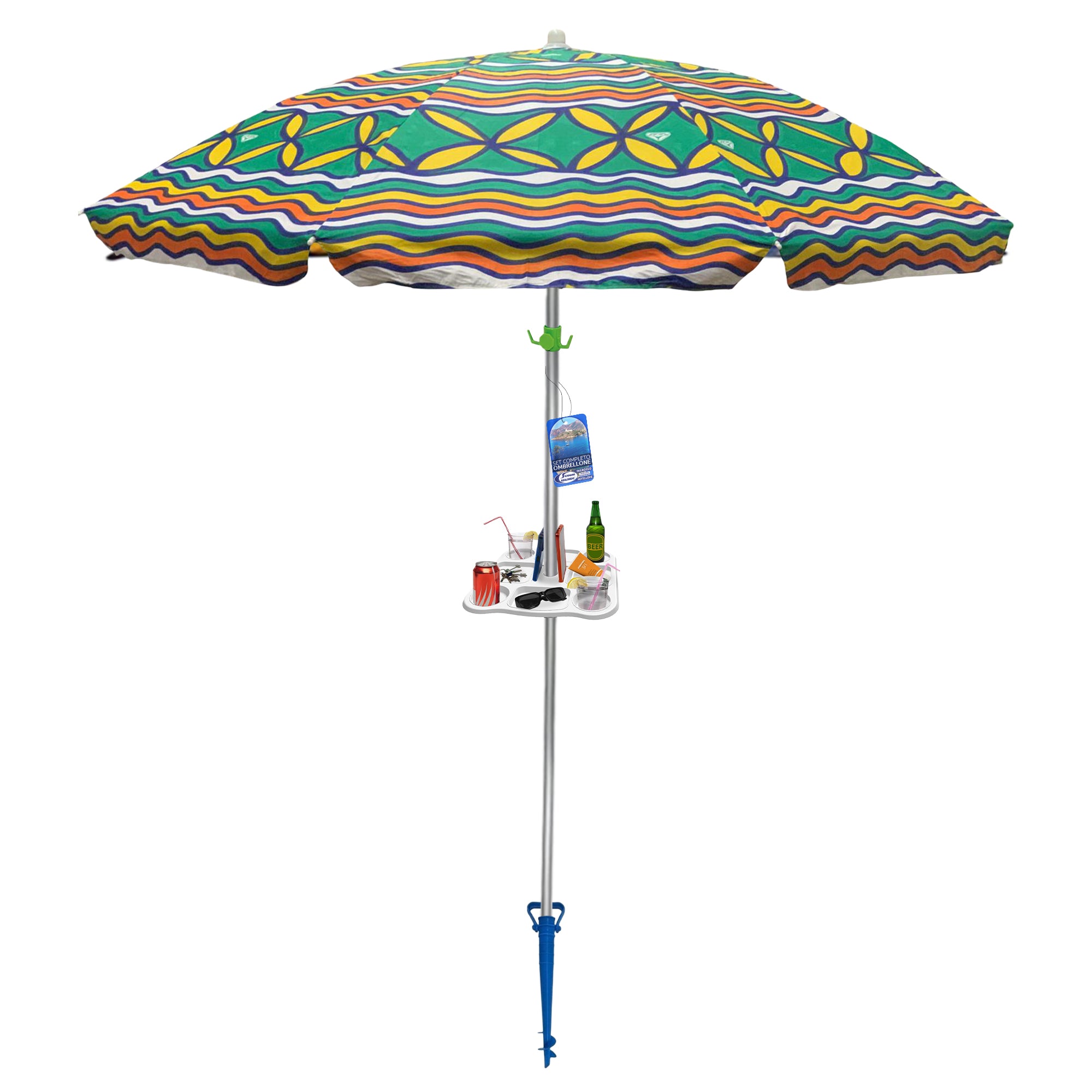Il tessuto in pregiato cotone stampato assicura un'ombra densa e fresca. Grazie allo snodo regolabile, puoi inclinare la copertura seguendo il sole senza dover spostare il palo. In più, la punta a trivella integrata ti permette di avvitarlo saldamente nella sabbia in un attimo, senza faticare.