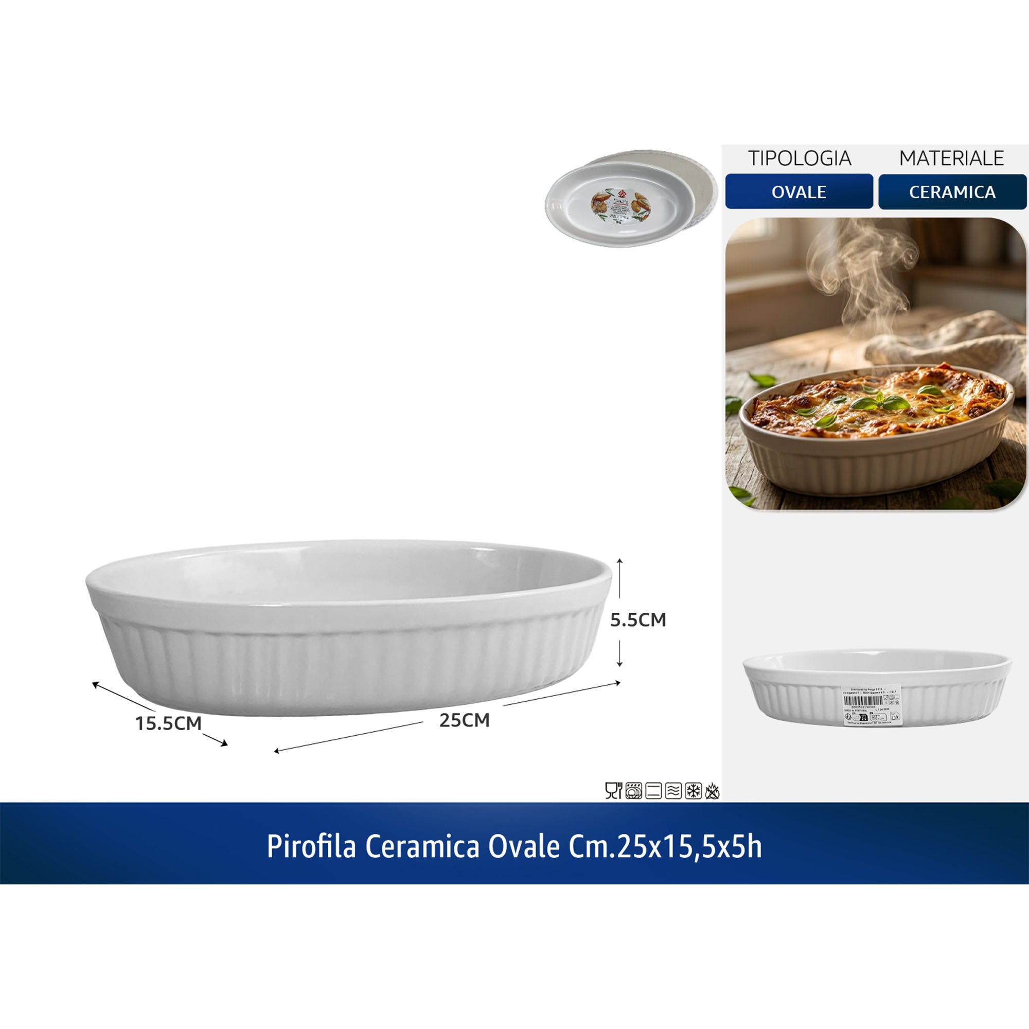 Pirofila Ceramica Ovale, 25 x 15.5 x 5h cm, Bianco, Idonea alla Lavastoviglie, Forno, Microonde, Freezer