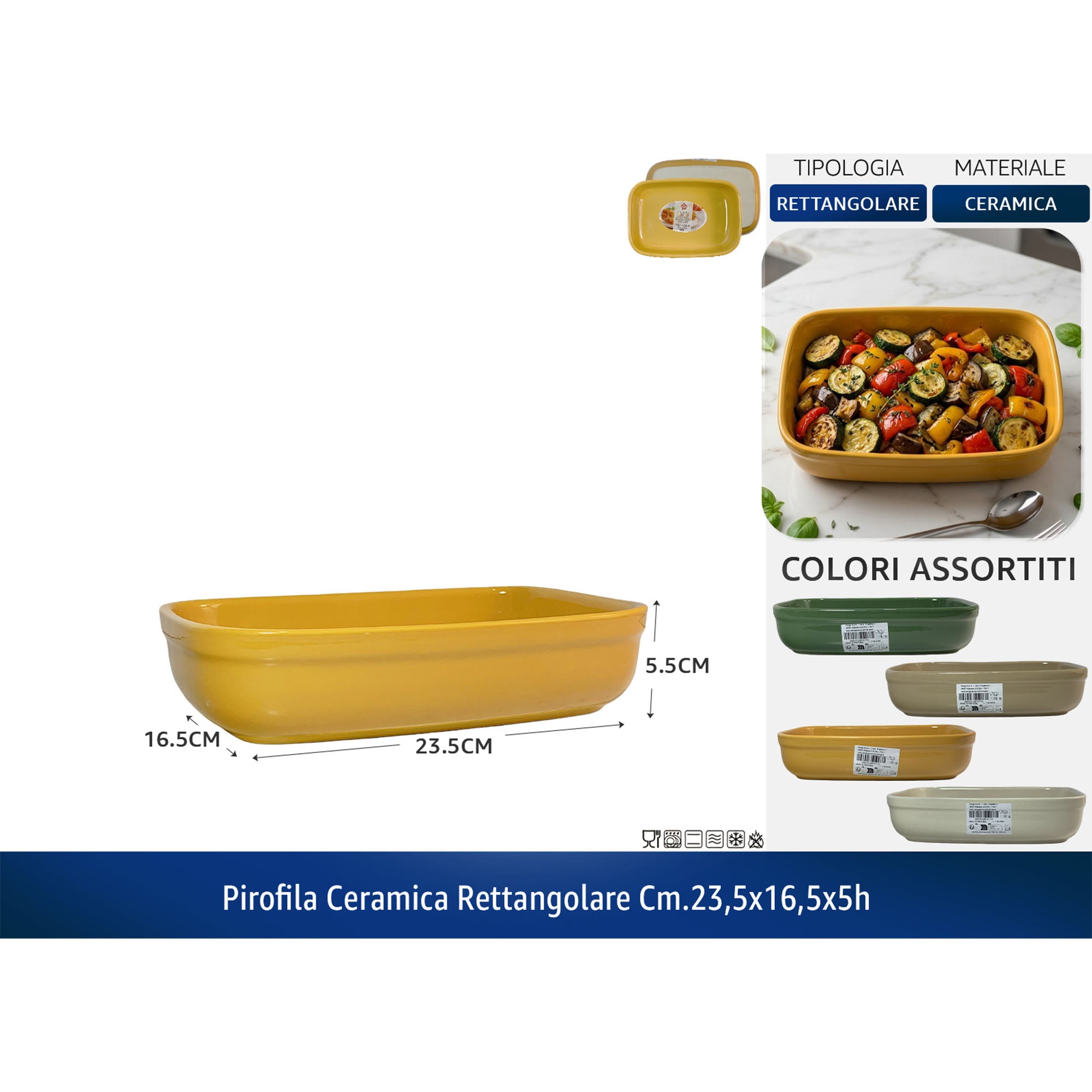 Pirofila Ceramica Rettangolare, 23.5 x 16.5 x 5h cm, Colori Assortiti, Idonea alla Lavastoviglie, Forno, Microonde, Freezer