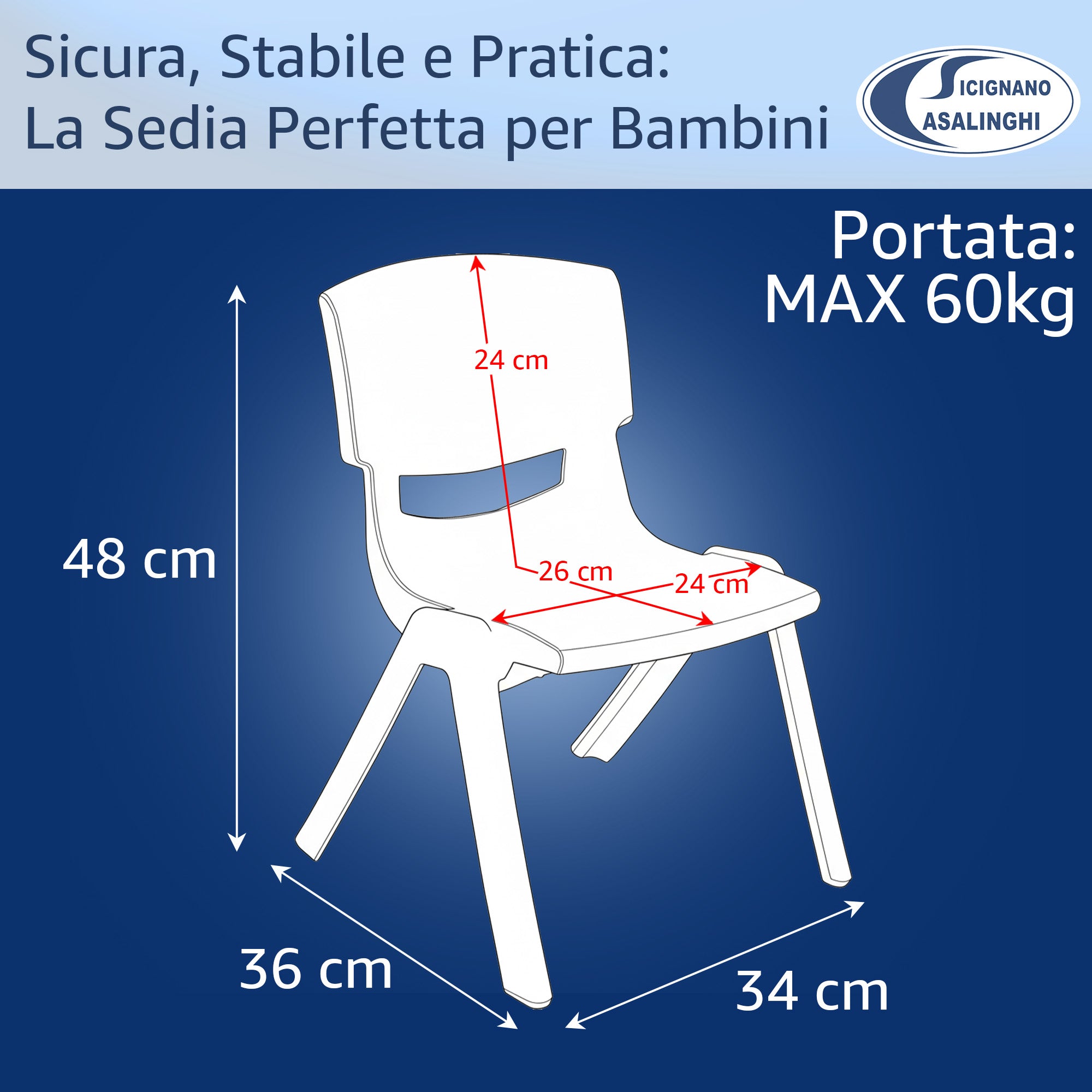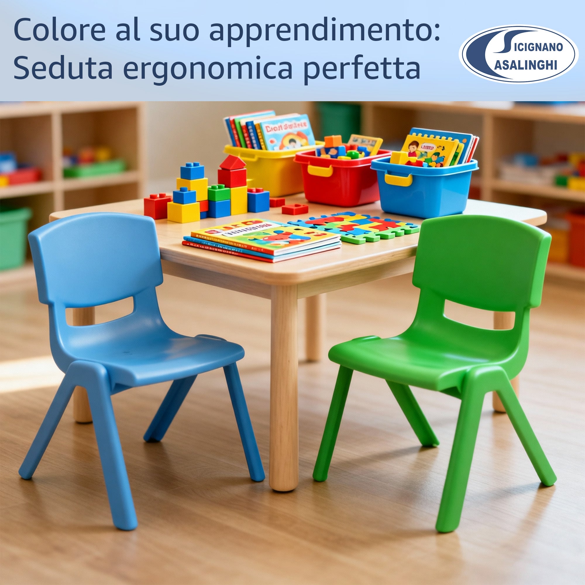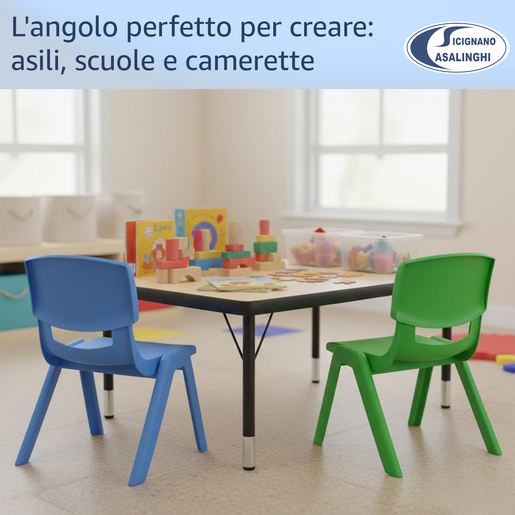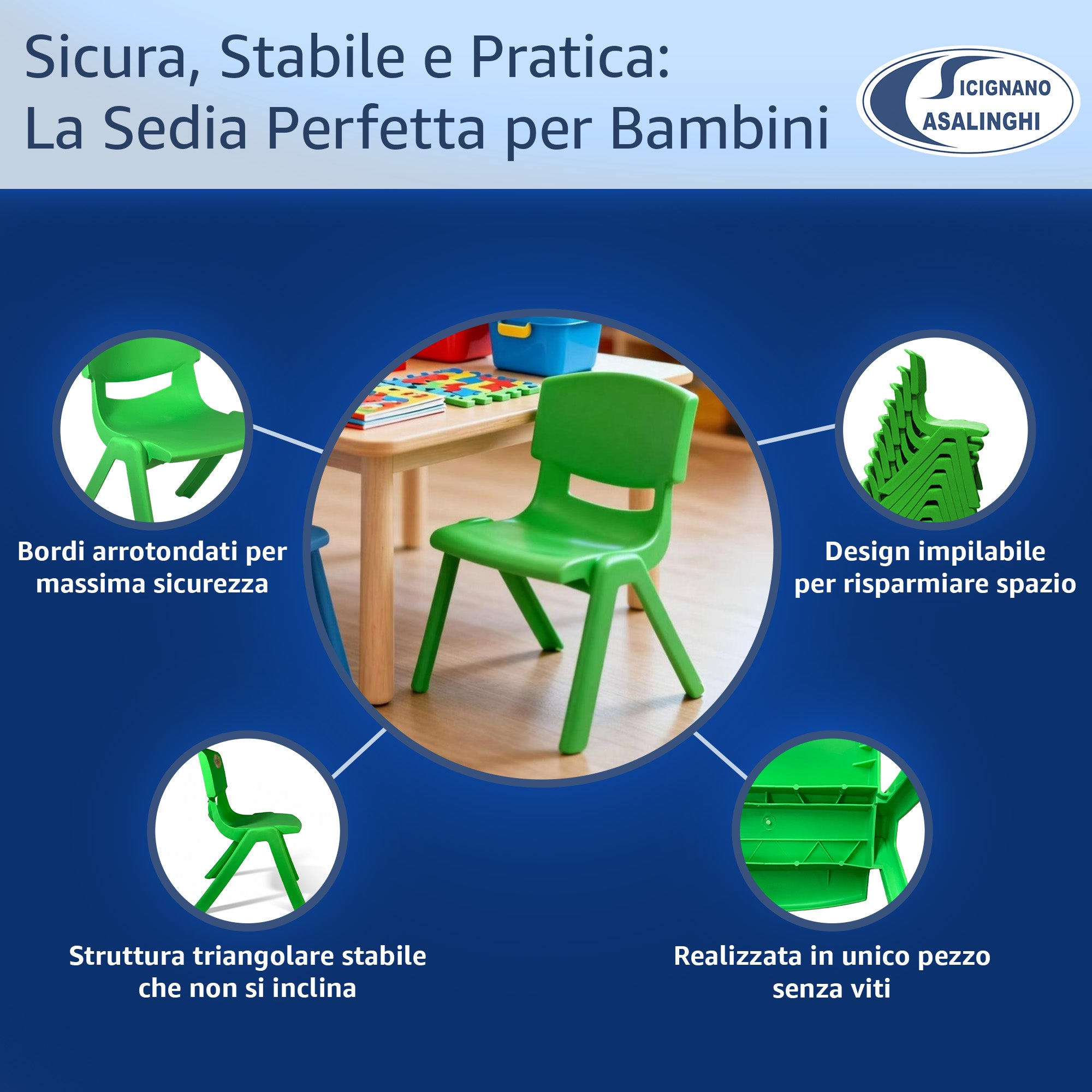 Sedia per Bambini in Plastica Impilabile, 36x33x48h cm, Portata 60 kg, Impermeabile per Interni ed Esterni - Azzurro, Verde e Bianco