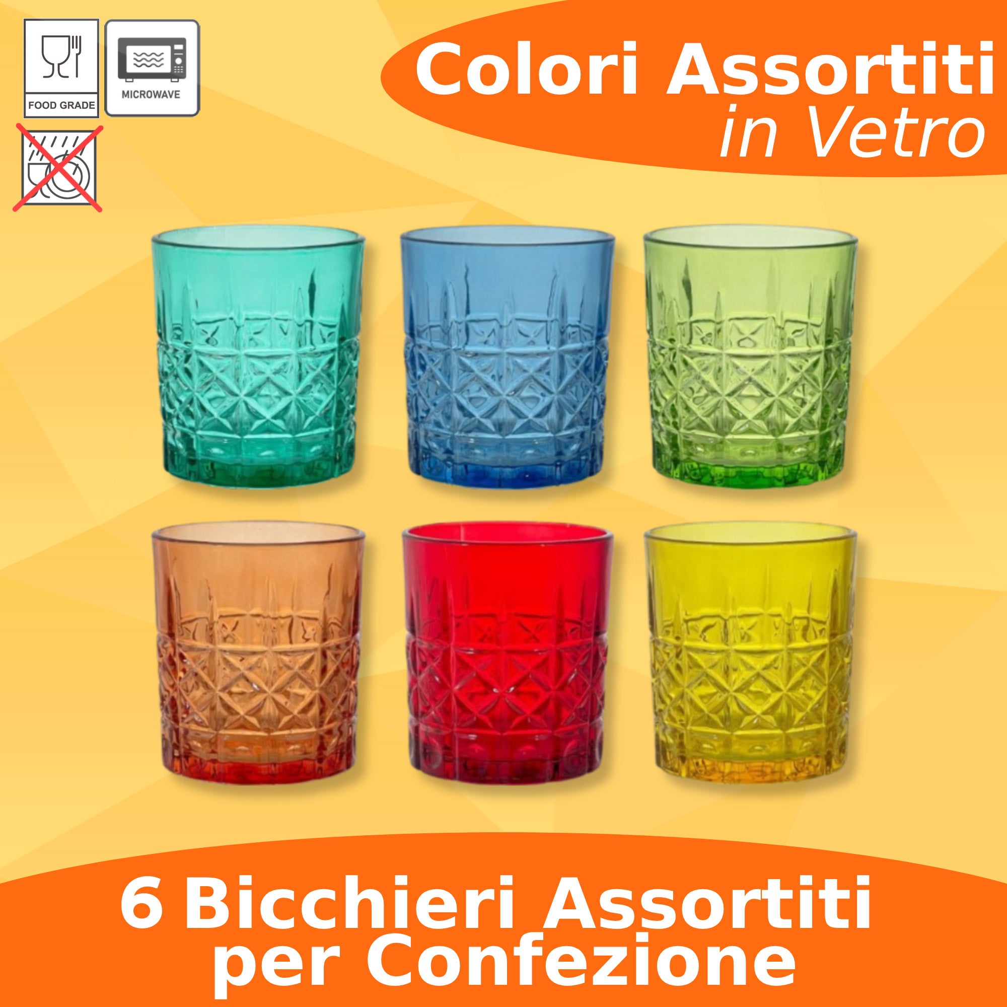 colori assortiti e vibranti: ogni bicchiere del set presenta una colorazione diversa e brillante (spesso con sfumature trasparenti che richiamano i toni dell'arcobaleno), creando un caleidoscopio sulla tua tavola. L'assortimento rende il servizio dinamico e divertente.