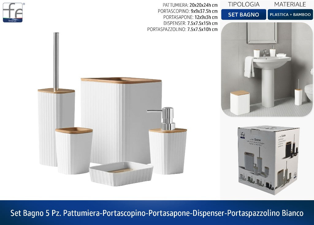 SET BAGNO 5 PZ. PATTUMIERA-PORTASCOPINO-PORTASAPONE-DISPENSER-PORTASPAZZOLINO BIANCO
