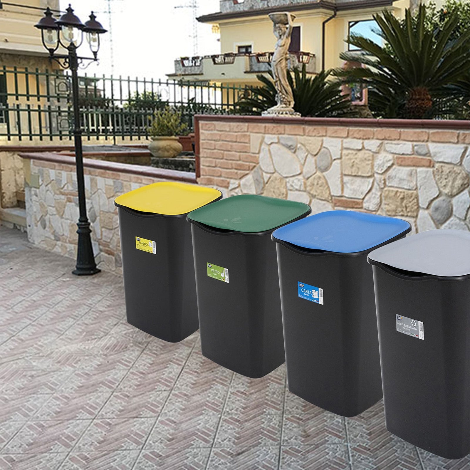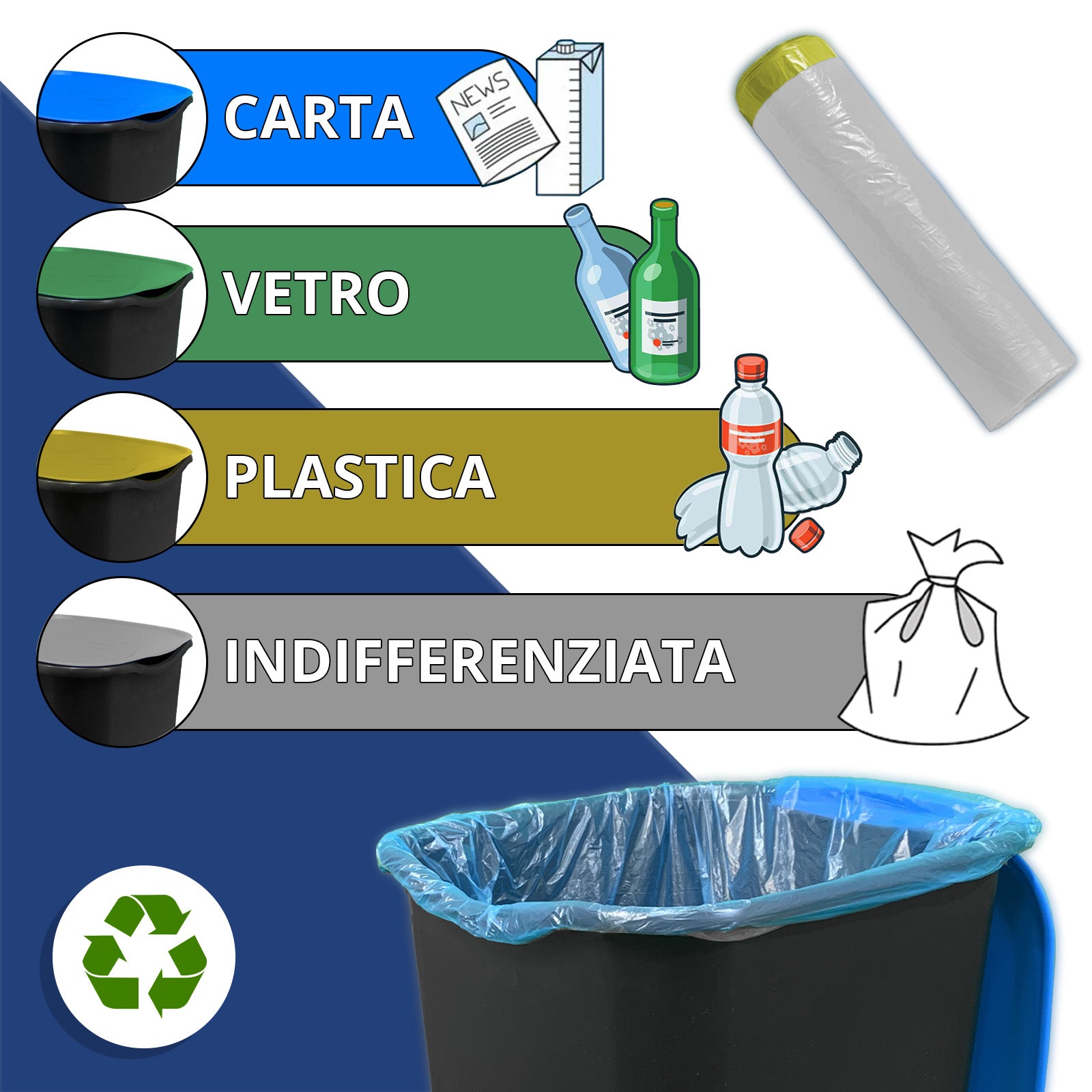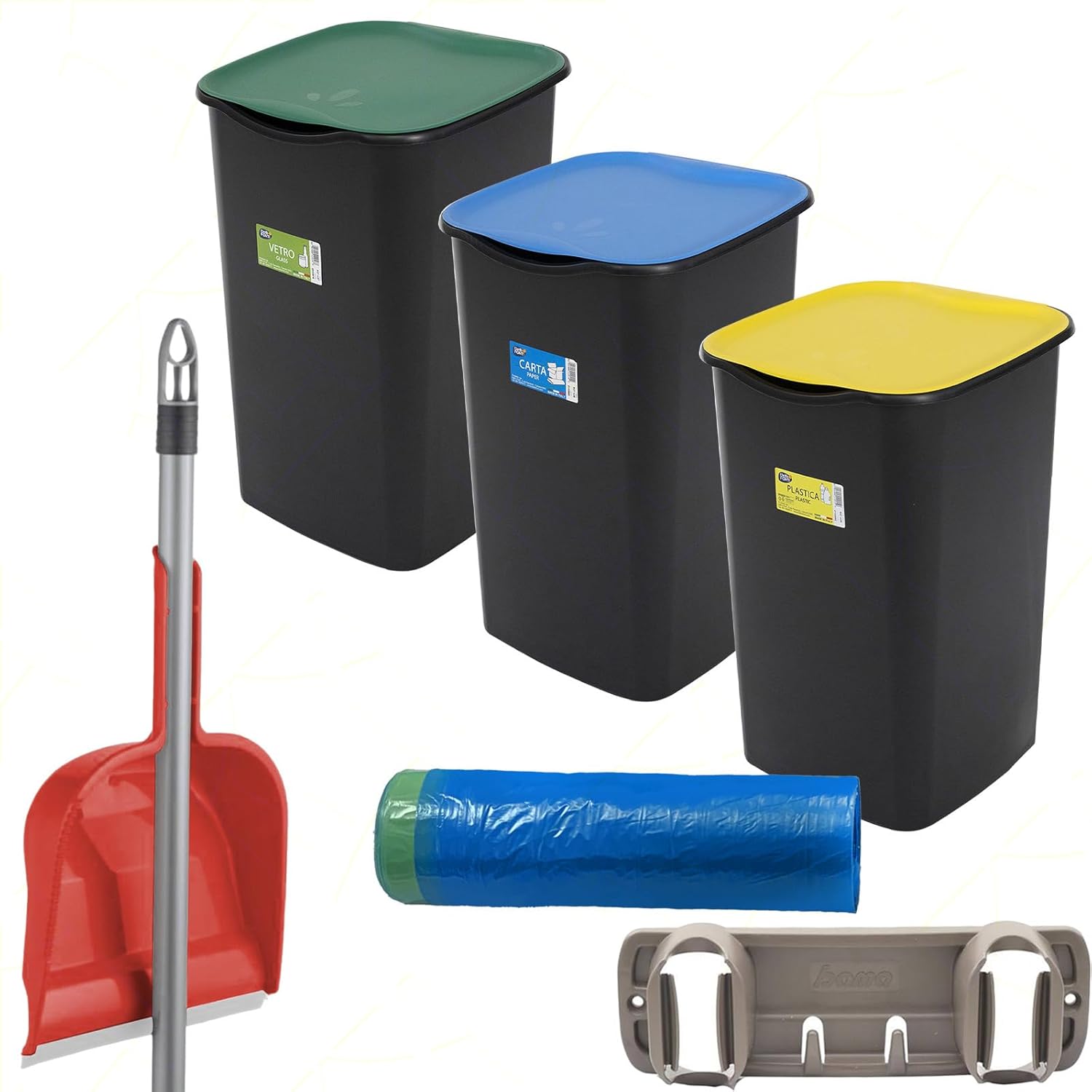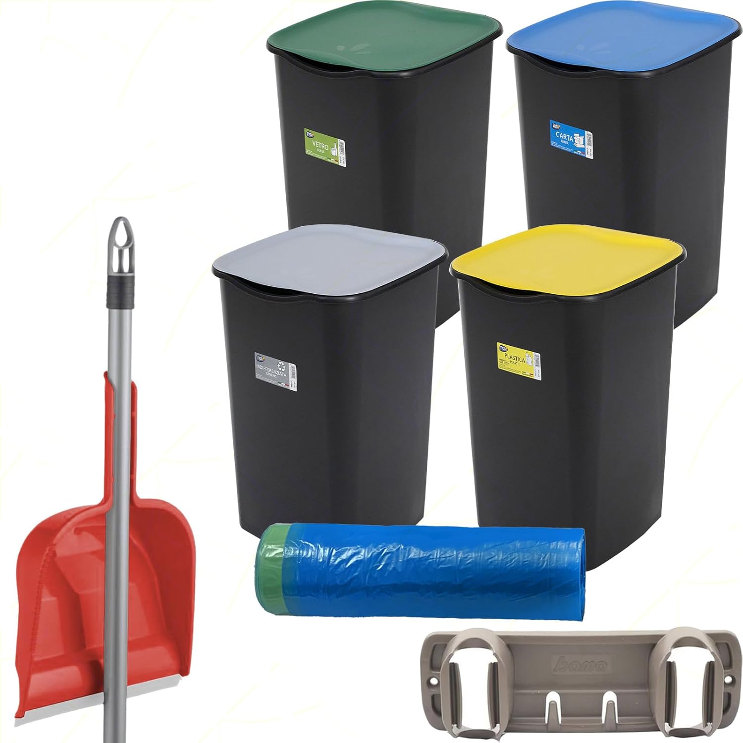 Set Pattumiere Riciclo con Coperchio Raccolta Differenziata Carta Vetro Plastica Indifferenziata 50 Litri, 15 Sacchetti, con Paletta e Appendiscope Colori Assortiti