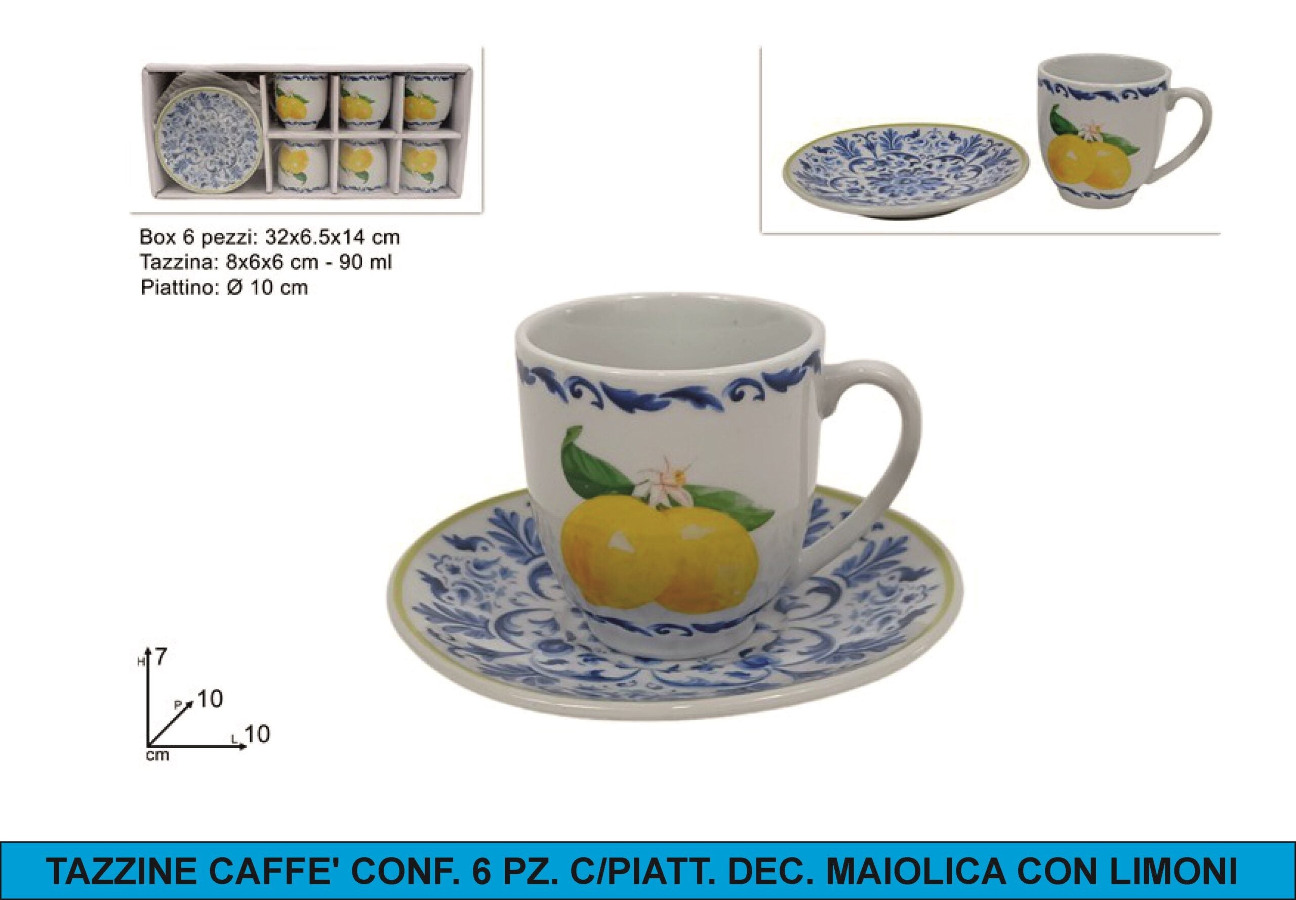 Tazzine Caffe' Conf. 6 Pz. C/Piatt. Dec. Maiolica Con Limoni