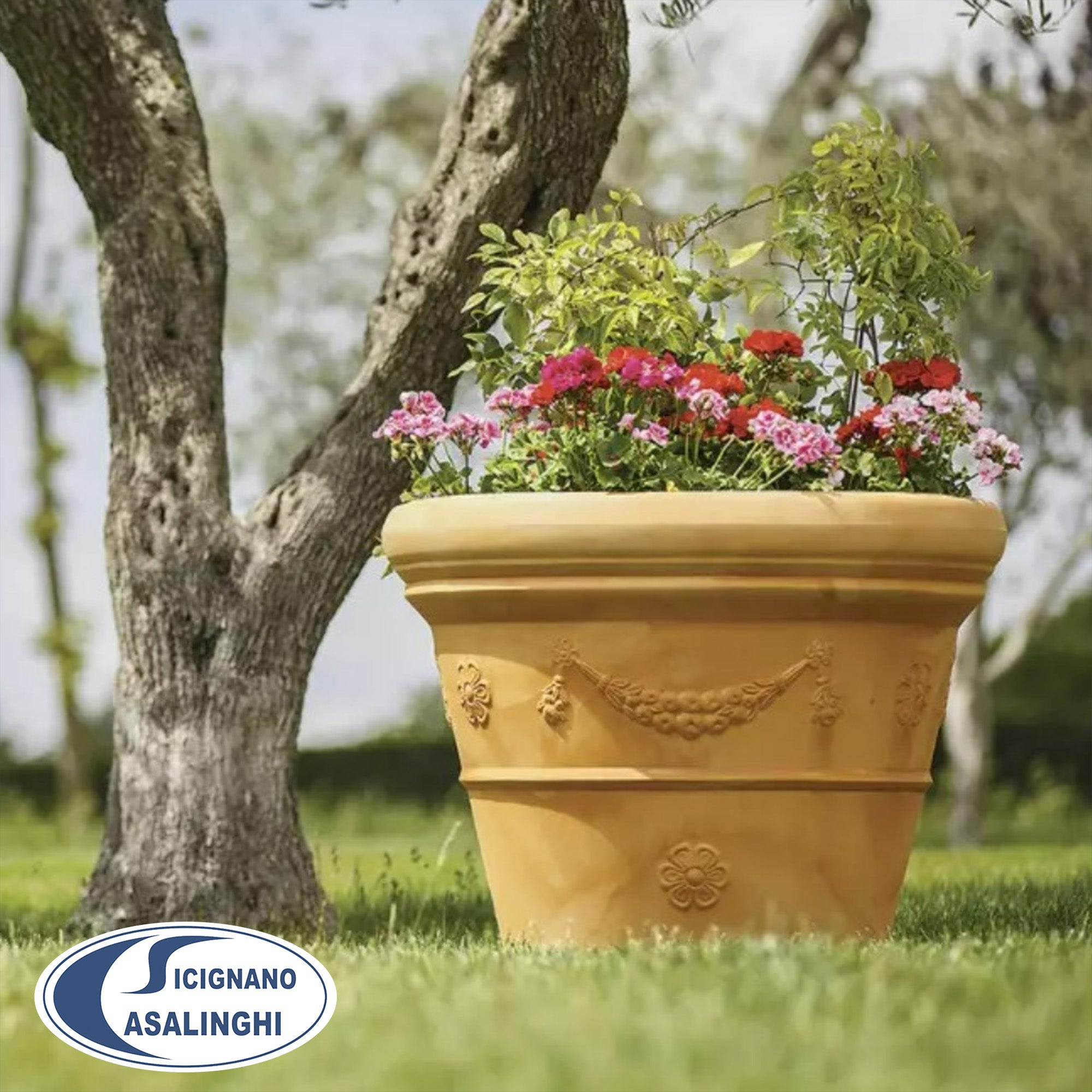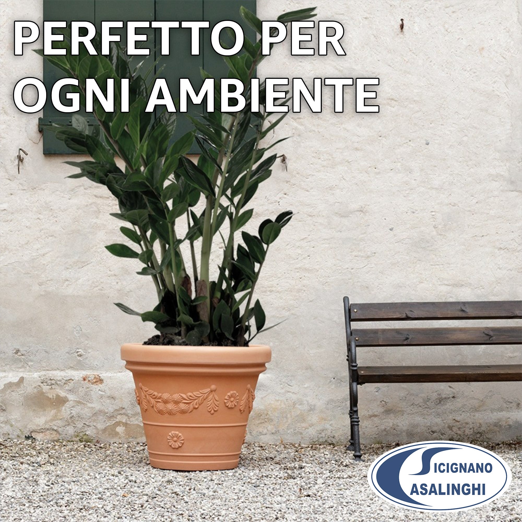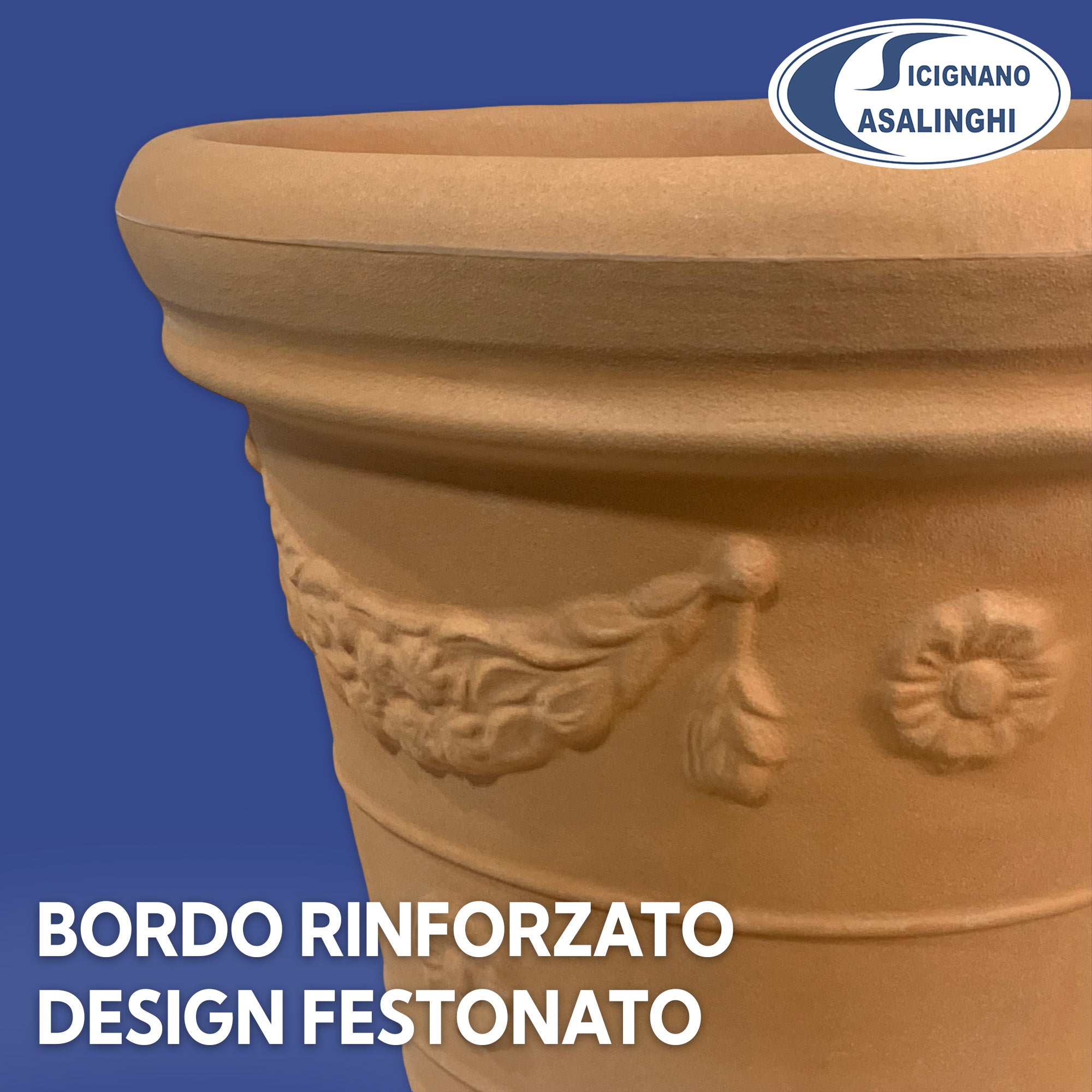 il vaso si ispira al rinomato stile impruneta, tipico della terracotta toscana, celebre per le sue forme eleganti e i dettagli artigianali. Il termine "festonato" si riferisce a un bordo decorativo che richiama ghirlande o festoni, aggiungendo un tocco di sofisticata classicità. Il "doppio bordo" ne rafforza ulteriormente l'estetica e la robustezza percepita.