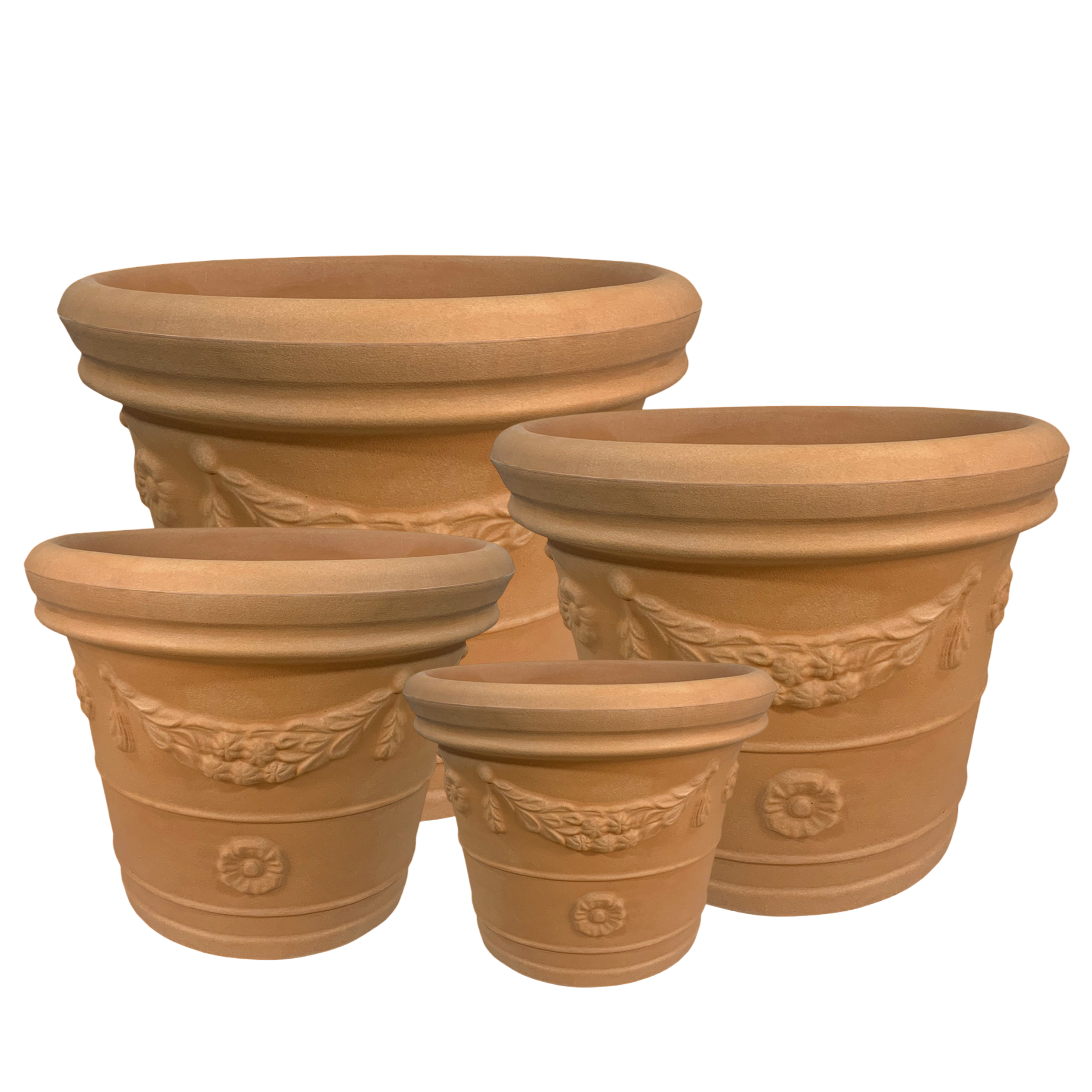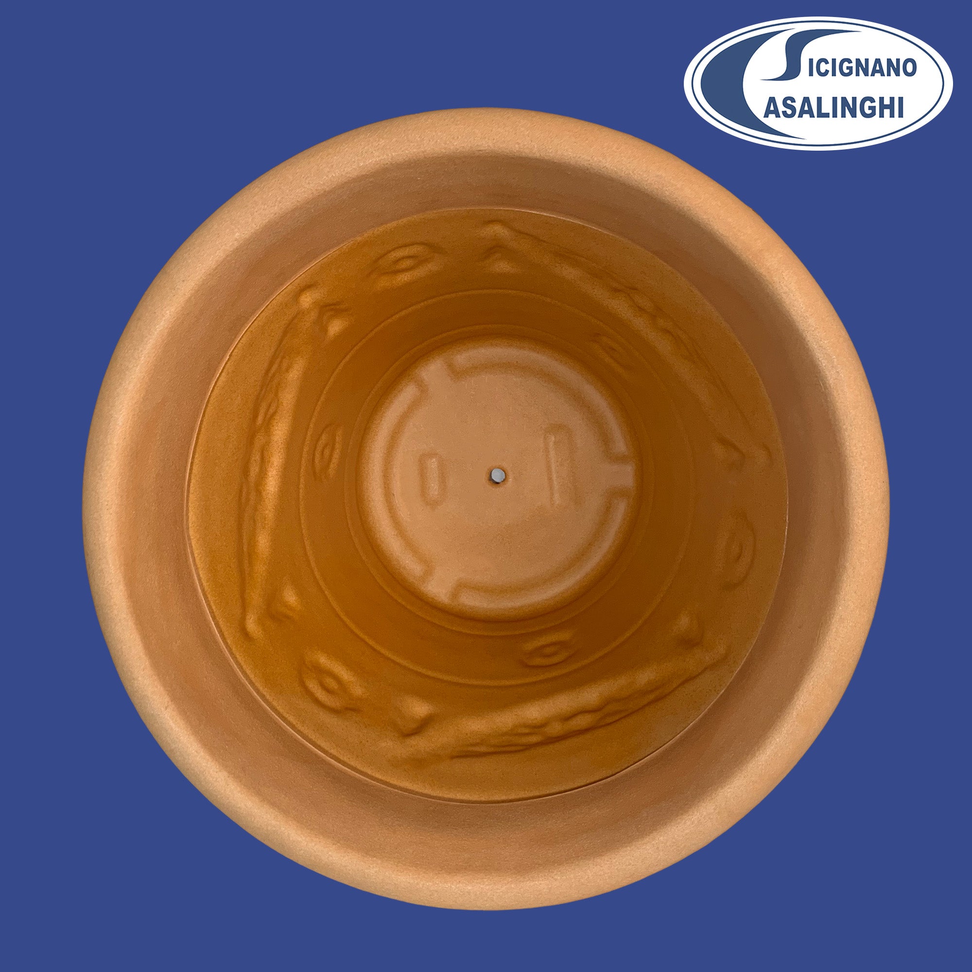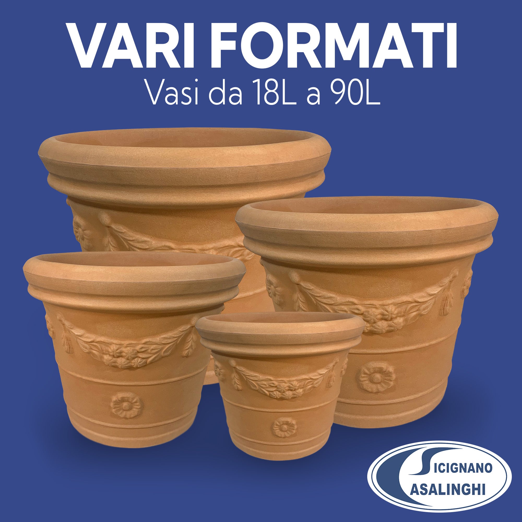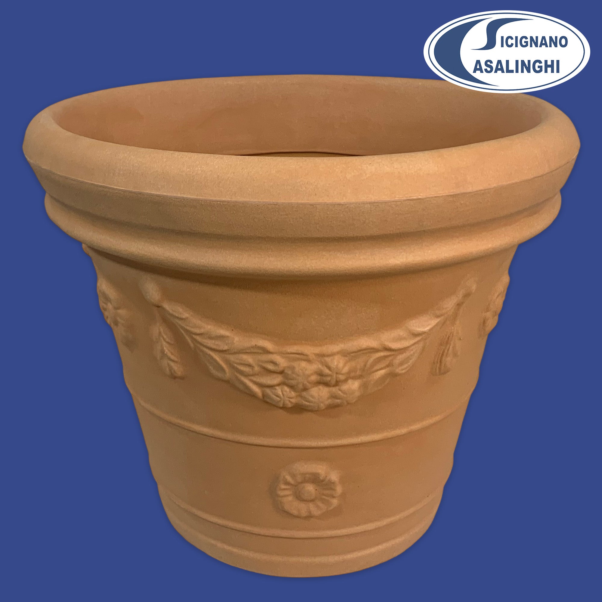 il vaso si ispira al rinomato stile impruneta, tipico della terracotta toscana, celebre per le sue forme eleganti e i dettagli artigianali. Il termine "festonato" si riferisce a un bordo decorativo che richiama ghirlande o festoni, aggiungendo un tocco di sofisticata classicità. Il "doppio bordo" ne rafforza ulteriormente l'estetica e la robustezza percepita.