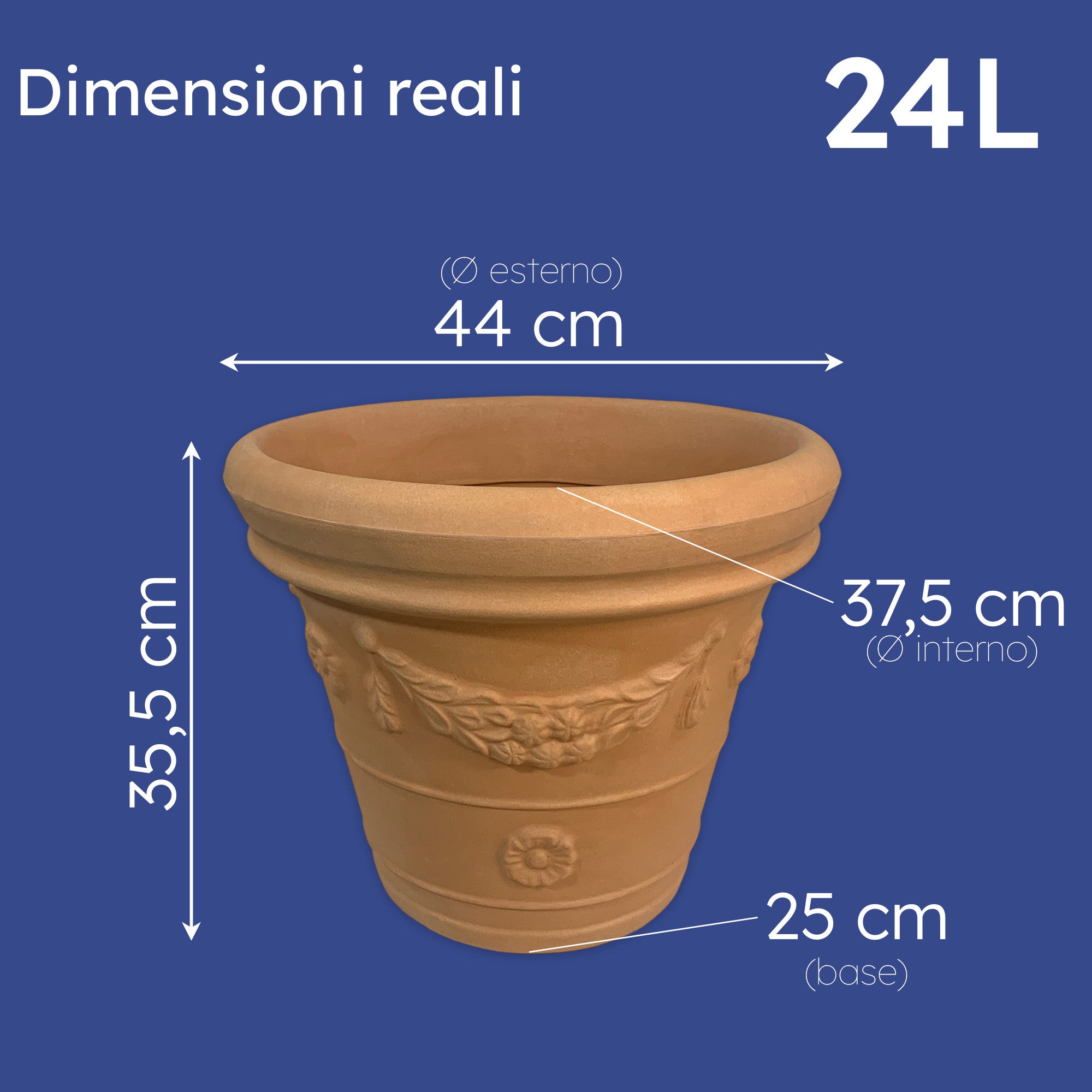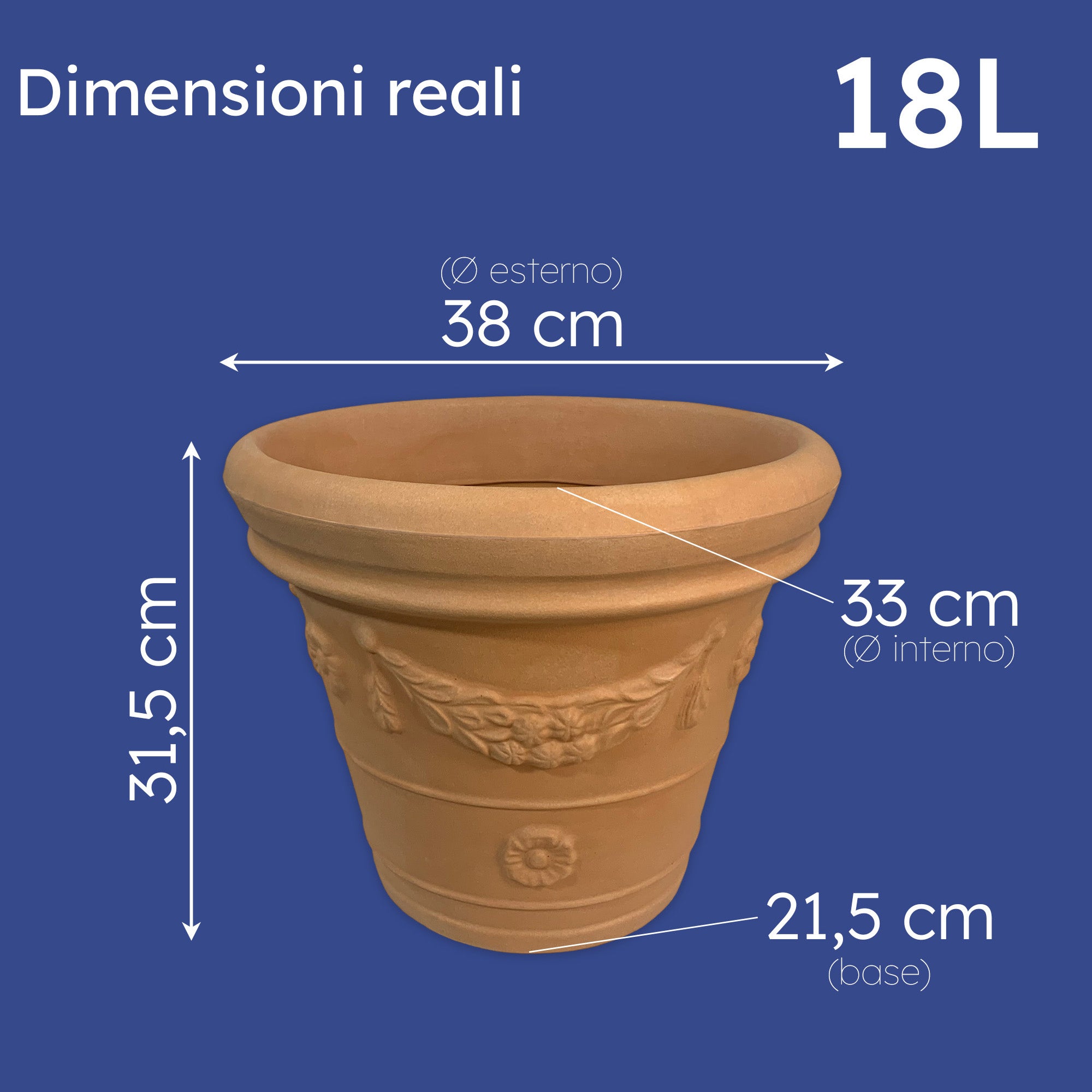 resistenza agli agenti atmosferici: a differenza della terracotta, la plastica di qualità è insensibile al gelo, ai raggi uv e agli sbalzi di temperatura. Non si crepa, non si rompe e non sbiadisce, garantendo una lunga durata anche nelle condizioni climatiche più avverse.